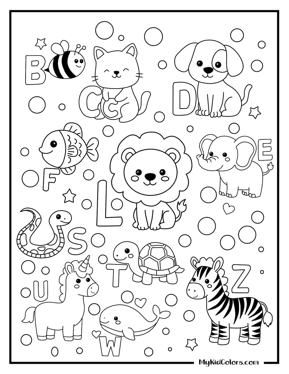 - Page 1: A playful alphabet collage with animals next to their letters—bee by B, cat by C, dog by D, fish by F, lion by L, elephant by E, snake by S, turtle by T, unicorn by U, whale by W, and zebra by Z.