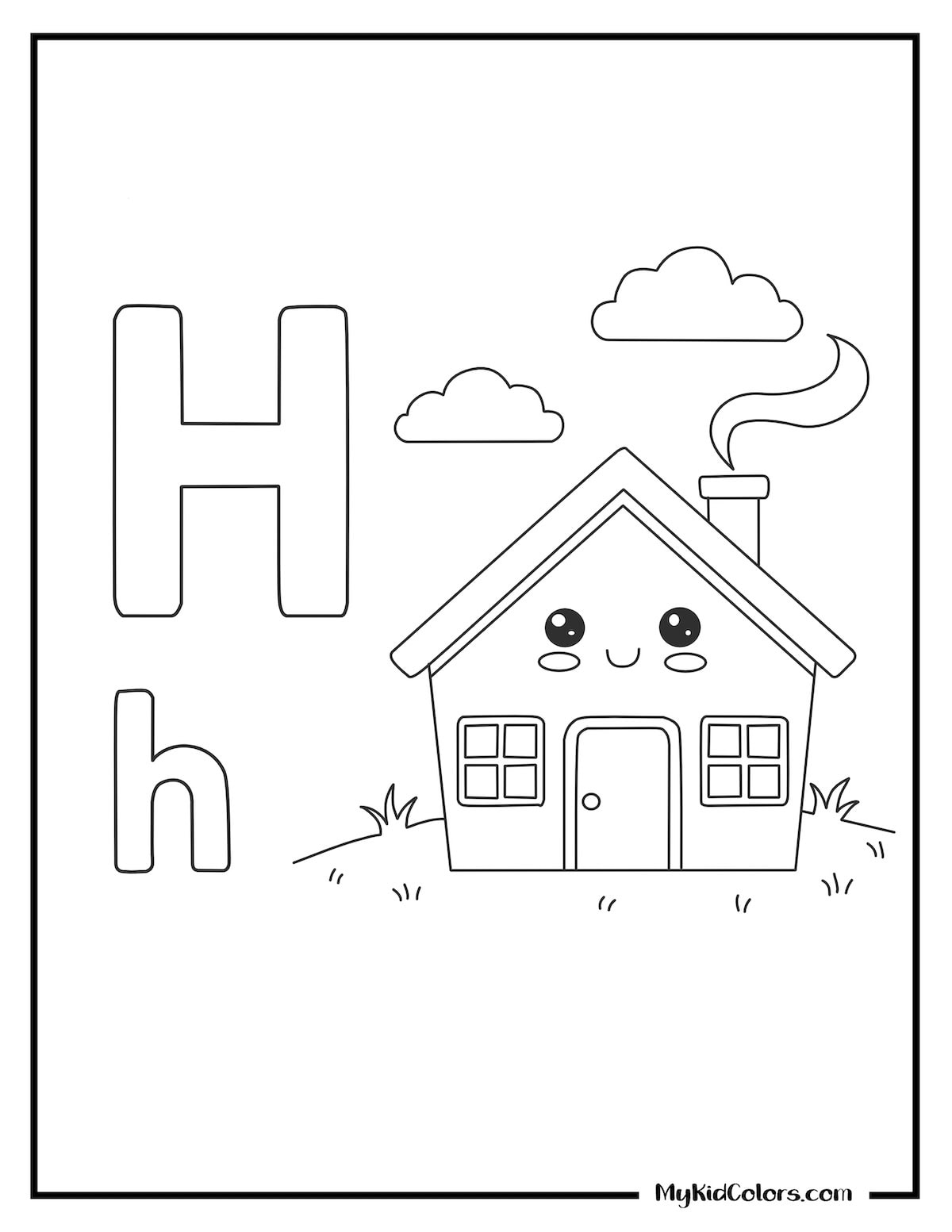 - Page 10: Uppercase and lowercase H next to a cozy house with smoke drifting from the chimney.