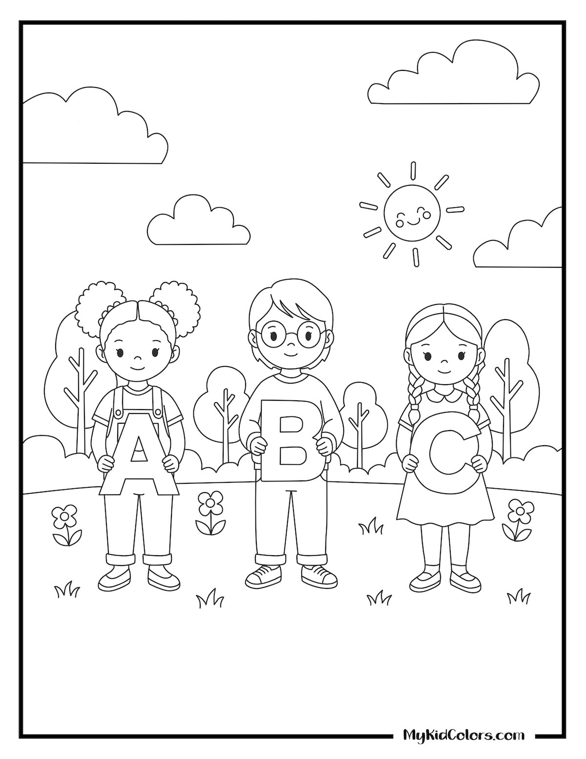 - Page 9: Three children of different appearances standing in a park, each holding A, B, or C—this page reflects MKC’s focus on inclusive kids colouring printables.