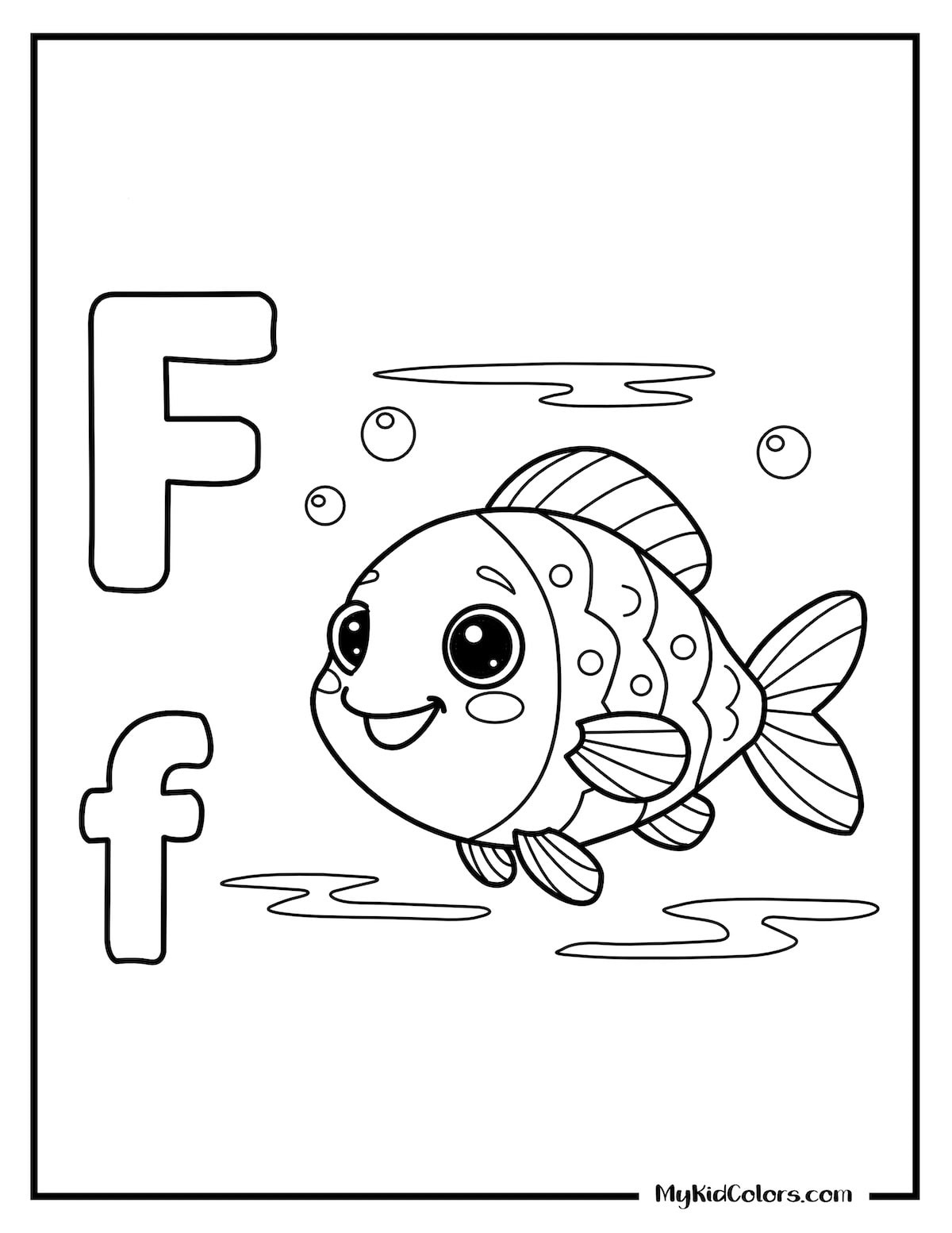 - Page 6: A happy fish swimming in bubbles next to uppercase and lowercase F, great for kids who love ocean-themed color letters alphabet free printable designs.