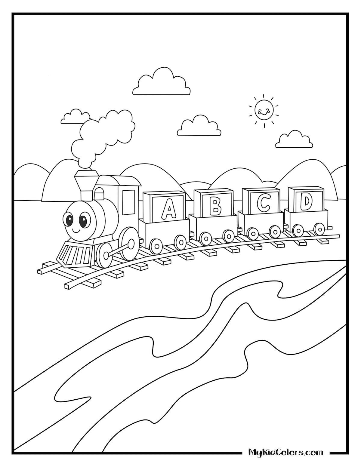 - Page 11: A smiling train chugging through a mountain landscape, with train cars labeled A, B, C, and D—great for pairing with numbers coloring pages too.