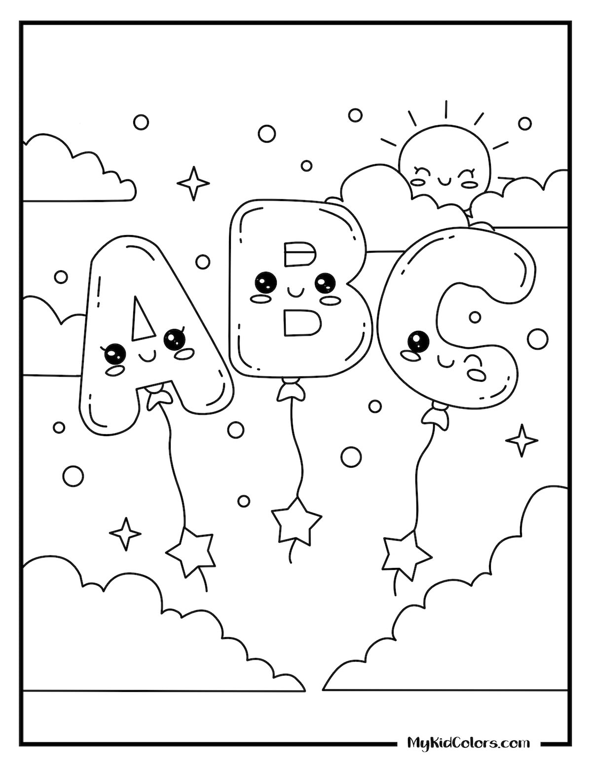 - Page 7: A, B, and C drawn as smiling balloons floating among clouds and a sunny sky, a fun intro to abc to color pages.