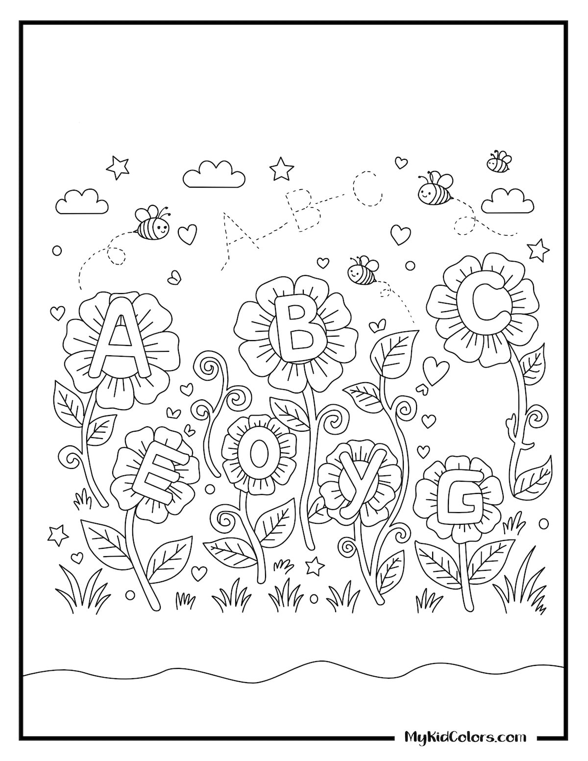 - Page 13: Dotted tracing lines for A, B, and C in a garden scene with bees, clouds, hearts, and flowers—perfect for alphabet coloring book free printables style practice.