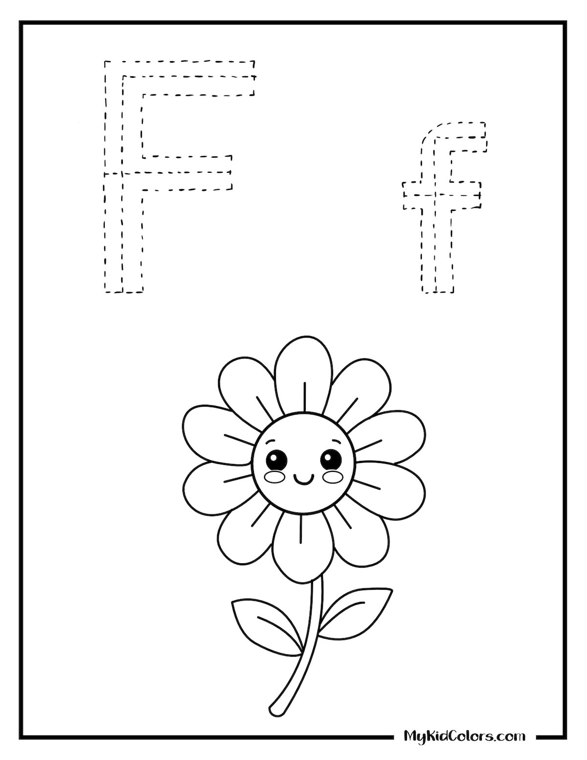 - Page 8: Tracing practice for uppercase and lowercase F with a cheerful flower, blending alphabet coloring worksheet for kids with handwriting.