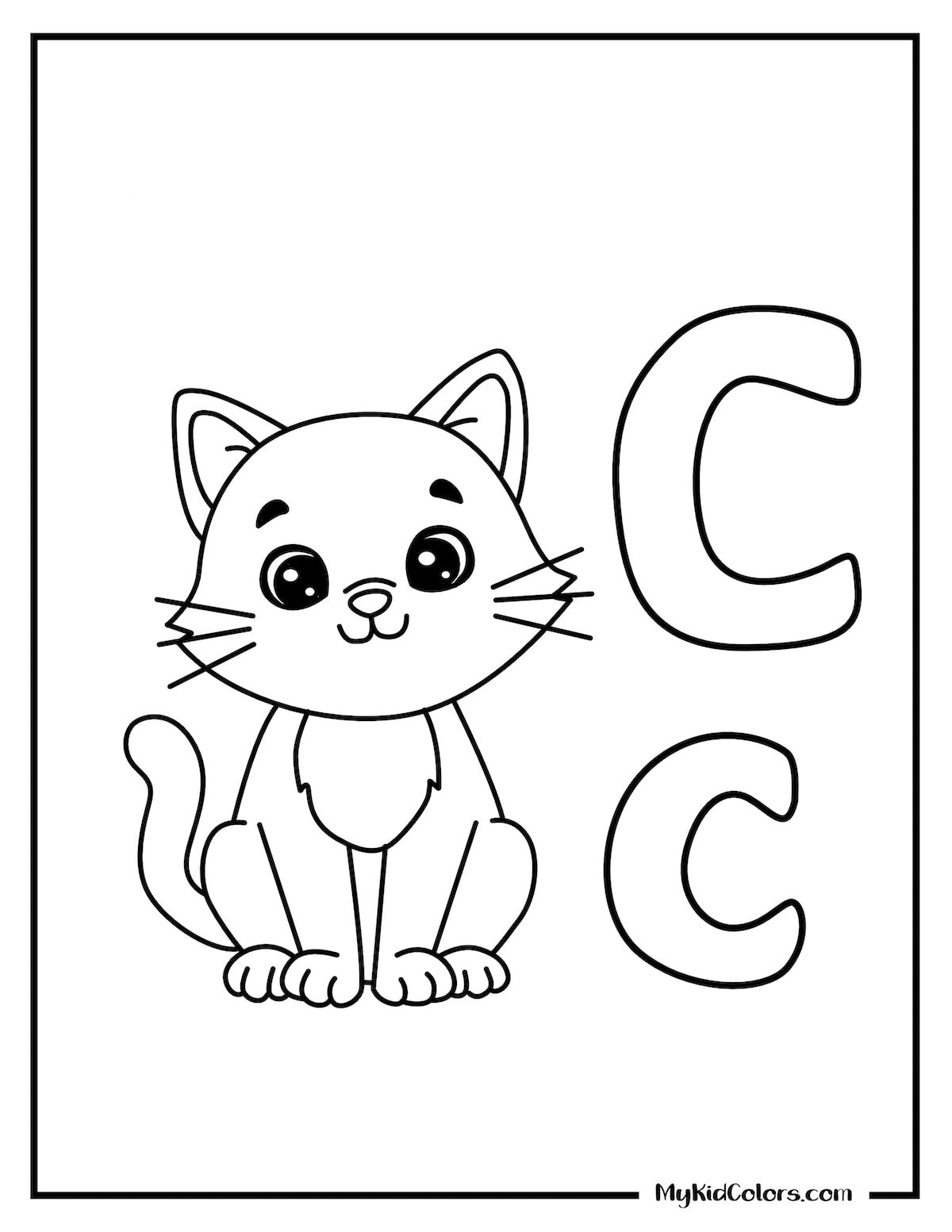 - Page 4: A friendly cat sitting next to uppercase and lowercase C, ideal for early coloring letters practice.