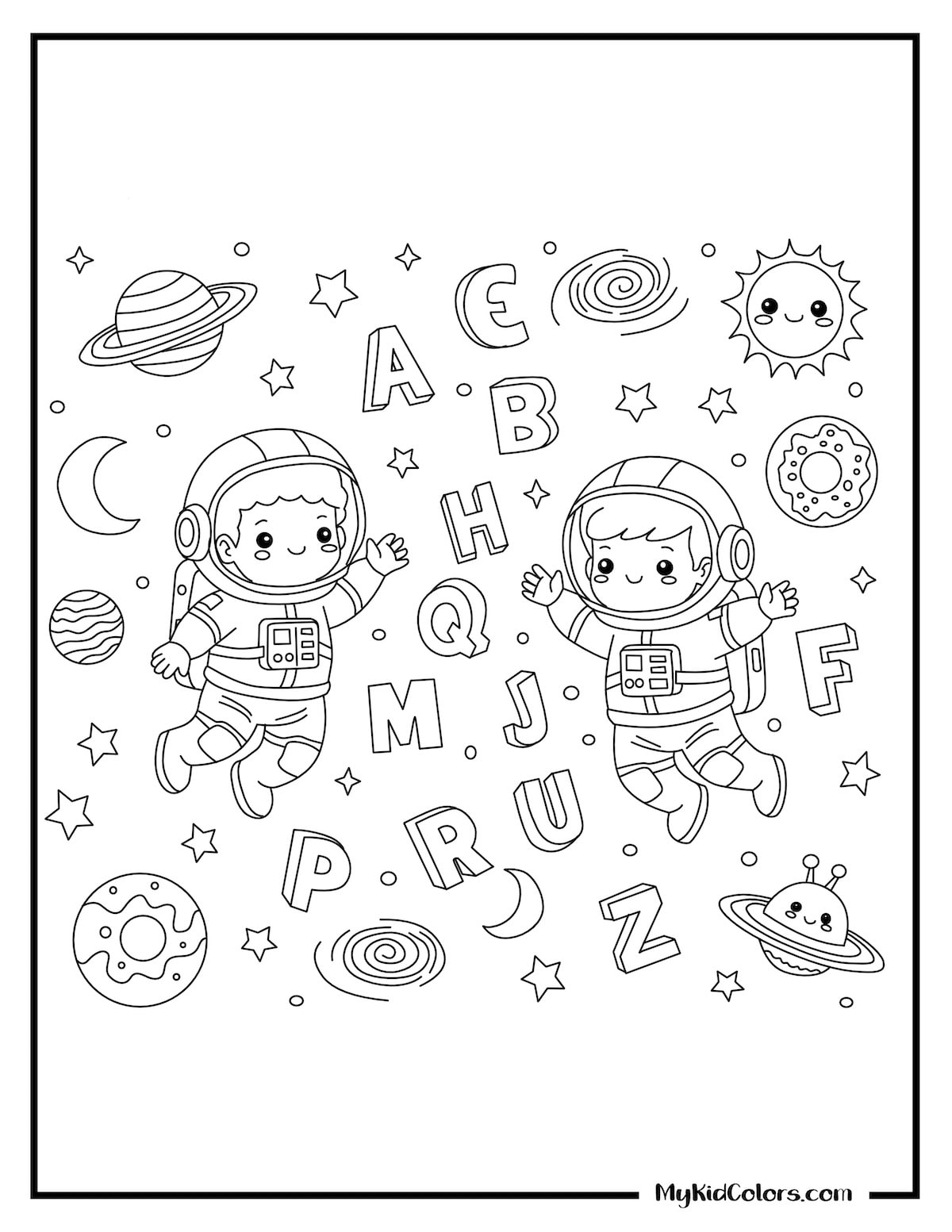 - Page 12: Space-themed alphabet fun with astronauts, planets, stars, and scattered letters (A, B, C, D, E, F, H, J, M, P, Q, R, T, U, V, Z).