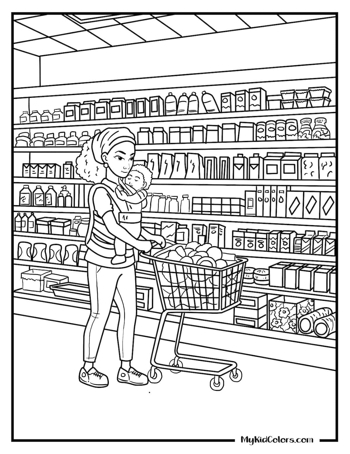 - Page 28: Supermarket scene — A mom with a baby shops in a grocery aisle full of items.
