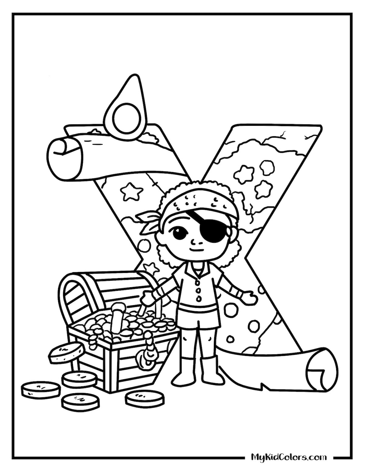 - Page 25: X — A pirate stands with a treasure map and chest next to the letter X.