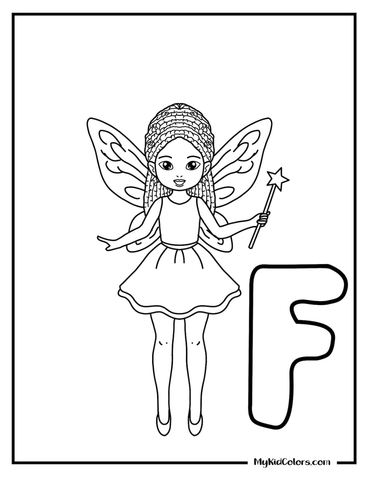 - Page 6: F — A fairy with wings and a wand standing beside the letter F.