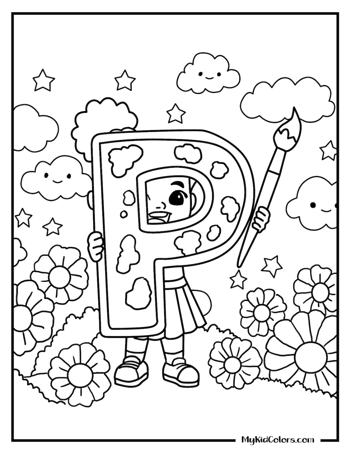 - Page 17: P — A child holding a paintbrush with a large P covered in paint splashes.
