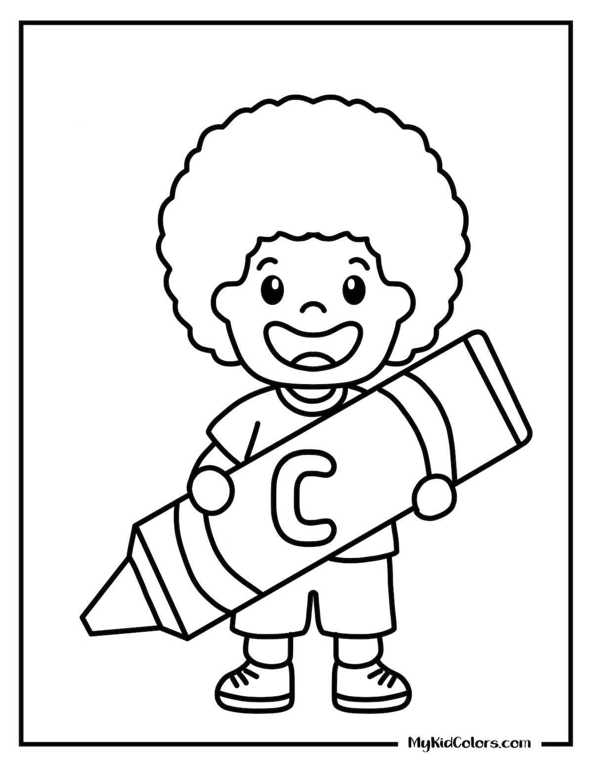 - Page 3: C — A happy child holding a giant crayon with the letter C on it.