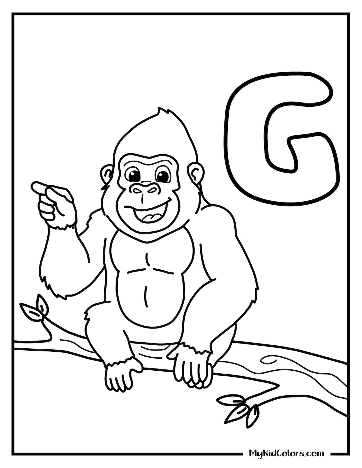 - Page 7: G — A smiling gorilla sitting on a tree branch next to the letter G.