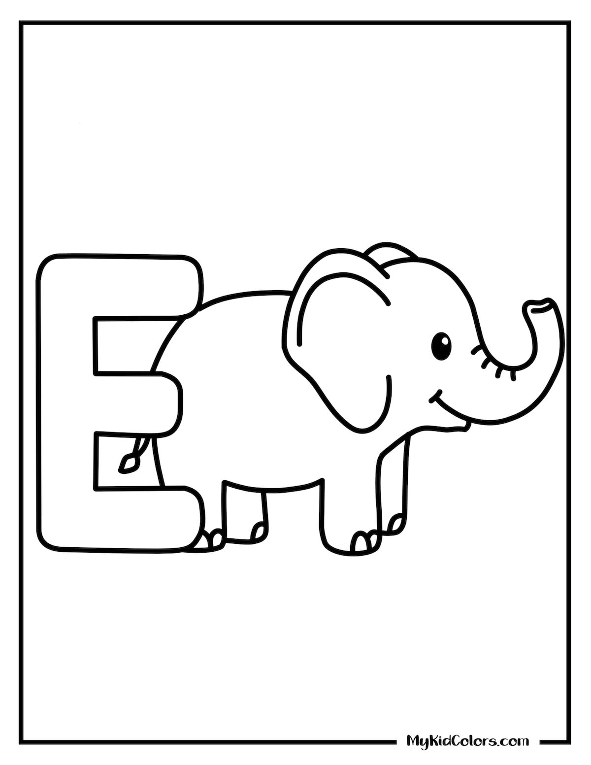 - Page 5: E — A friendly elephant leaning out from behind the letter E.