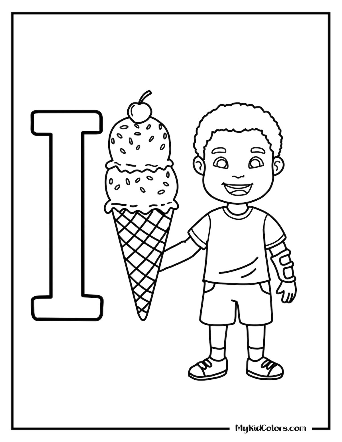 - Page 9: I — A kid holds a tall ice cream cone next to the letter I.