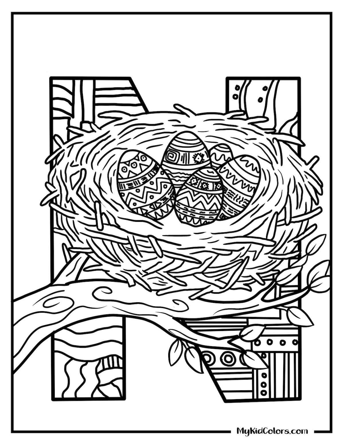- Page 14: N — A nest of decorated eggs resting against the letter N.