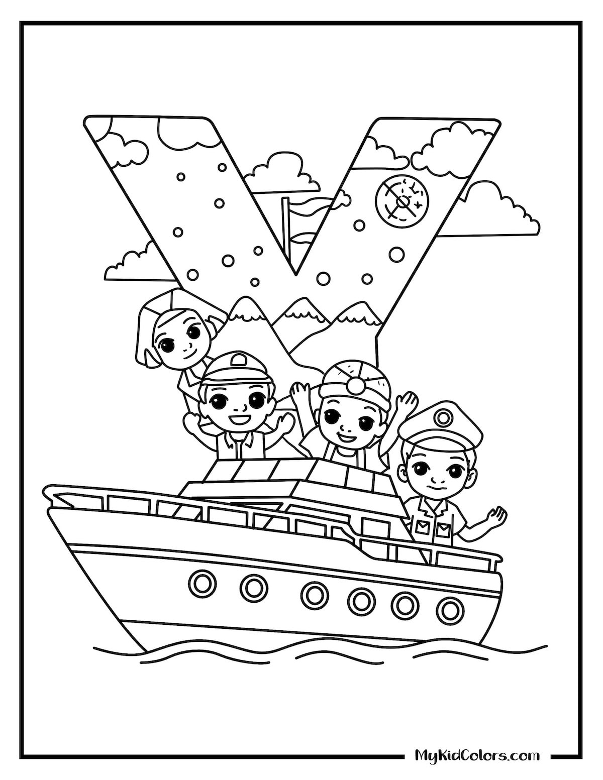 - Page 26: Y — Four kids enjoying a boat ride beneath a large letter Y.
