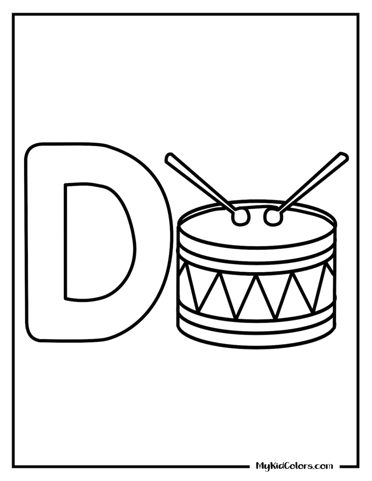 - Page 4: D — The letter D beside a drum with drumsticks.