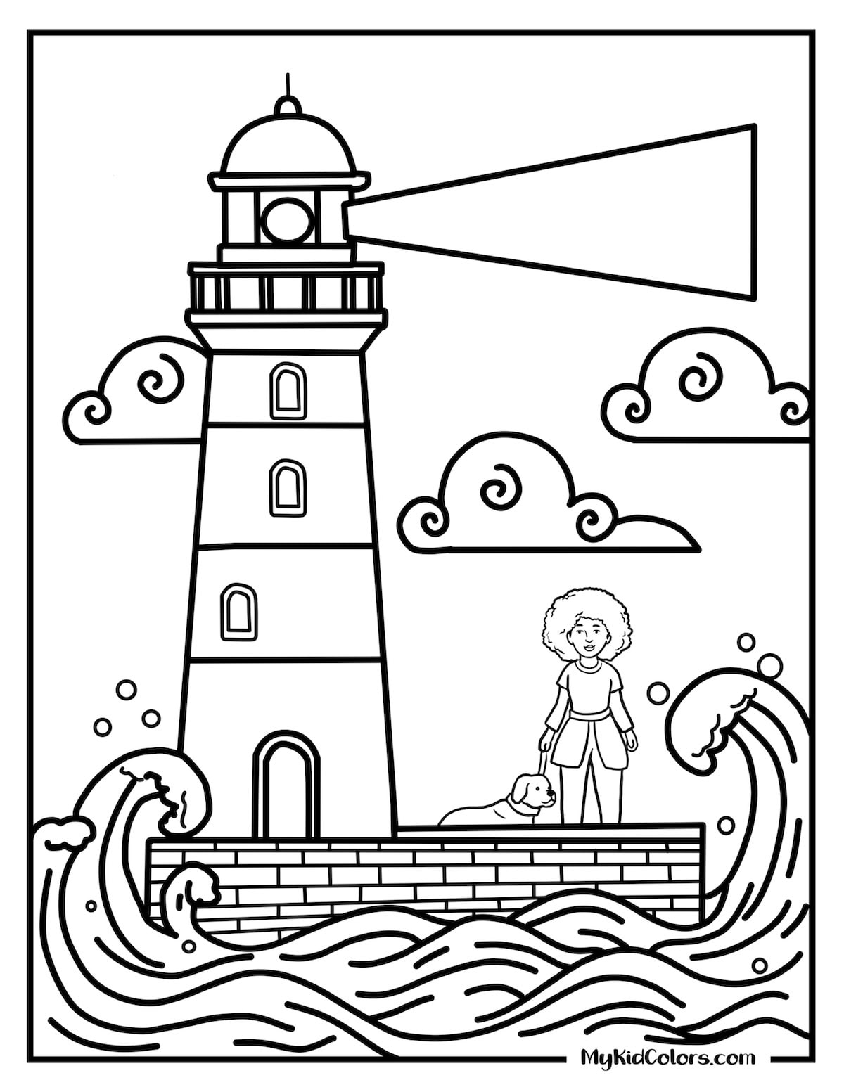 - Page 12: L — A lighthouse shining bright with a child and a dog by the waves.