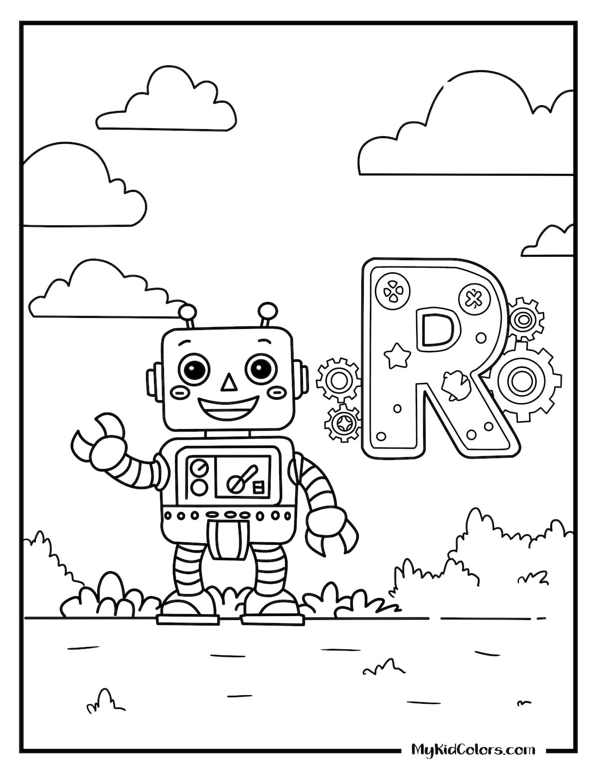 - Page 19: R — A cheerful robot waving beside the letter R decorated with gears and stars.