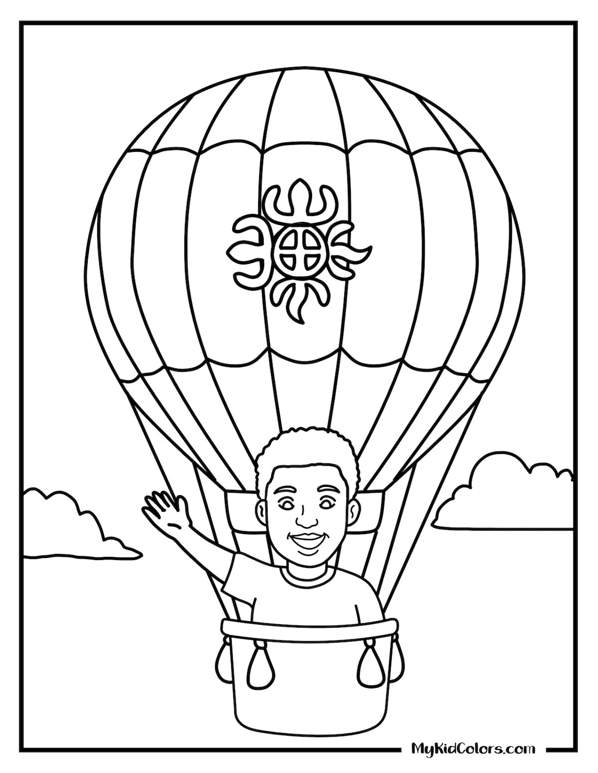 - Page 8: H — A child waving while riding in a hot air balloon shaped like the letter H.