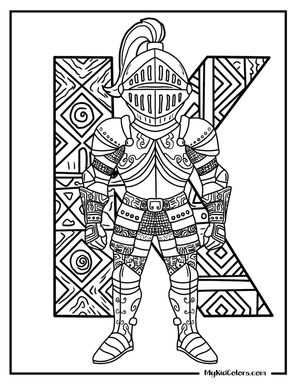 - Page 11: K — A knight in armor in front of a patterned letter K background.