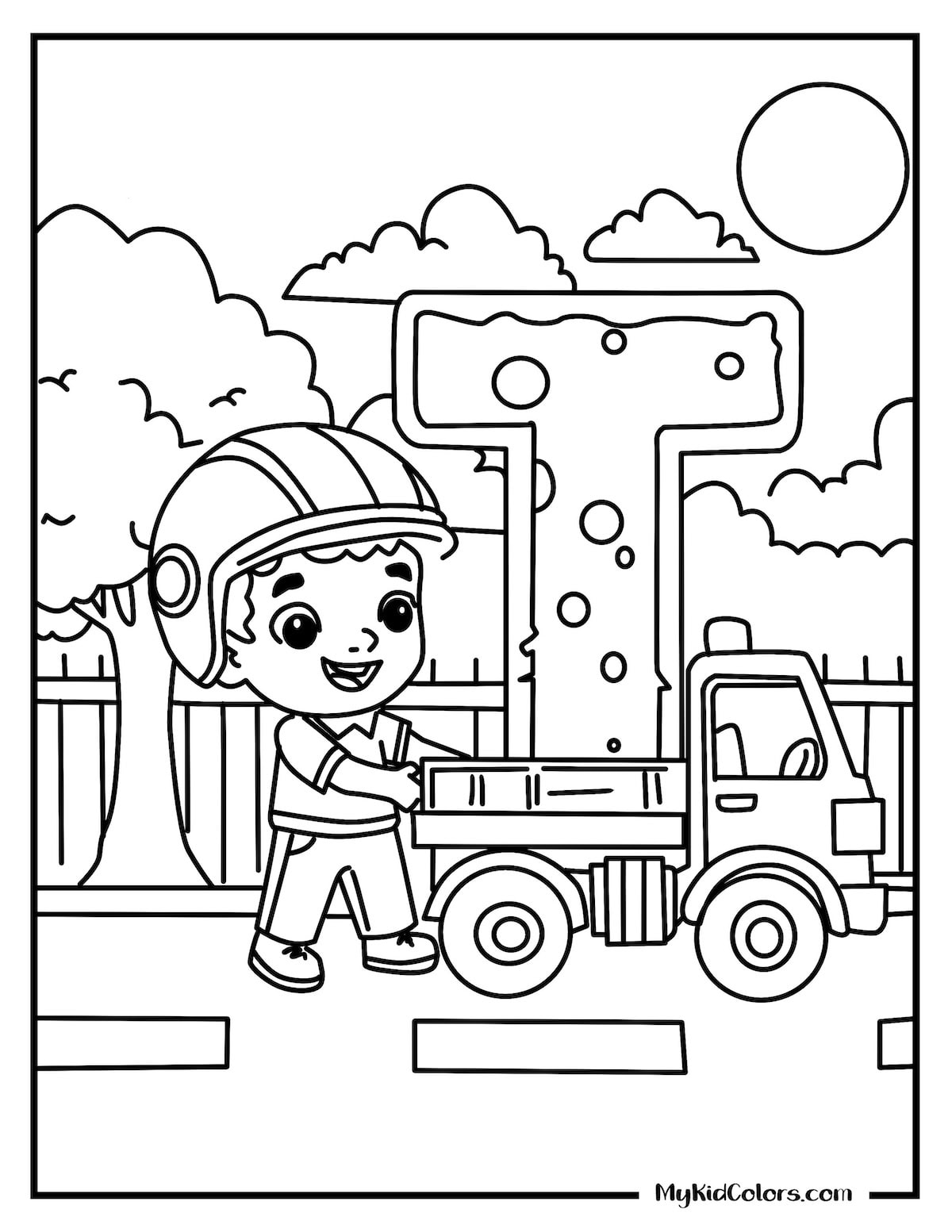 - Page 21: T — A kid wearing a helmet loads a tall T onto a toy truck.