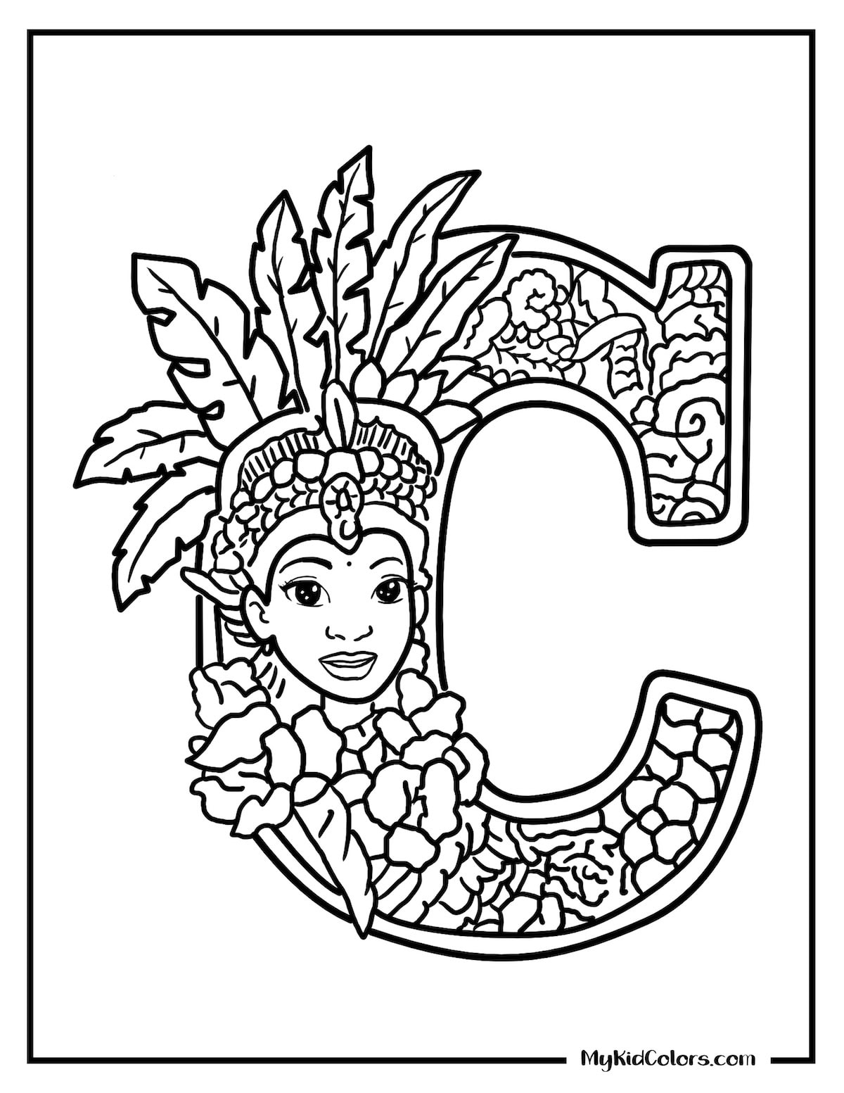 - Page 29: C (bonus illustration) — A Carnival-style C decorated with feathers and patterns around a smiling girl.