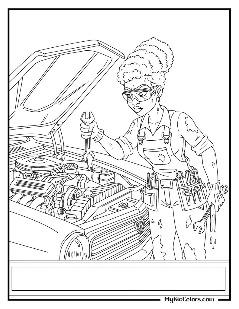 - For the “Female Mechanic” Page (Page 9): “Look at the person fixing the car. Did you know women are great mechanics too? What tool do you think she is reaching for?”