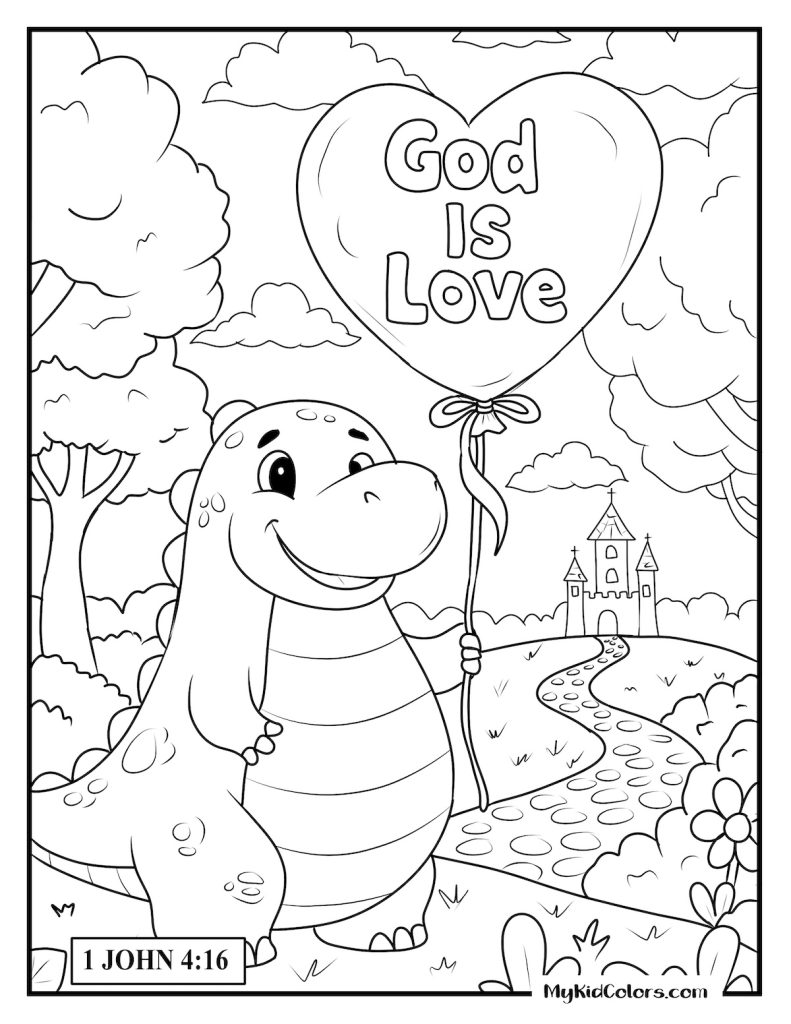 A friendly dinosaur holding a heart-shaped balloon — a favorite among preschoolers. - “God’s house” – Matthew 18:20