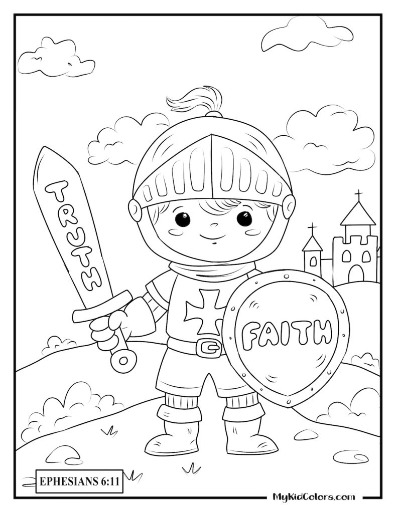 A young child wearing armor with “truth” and “faith” on sword and shield. - “As for me and my house” – Joshua 24:15