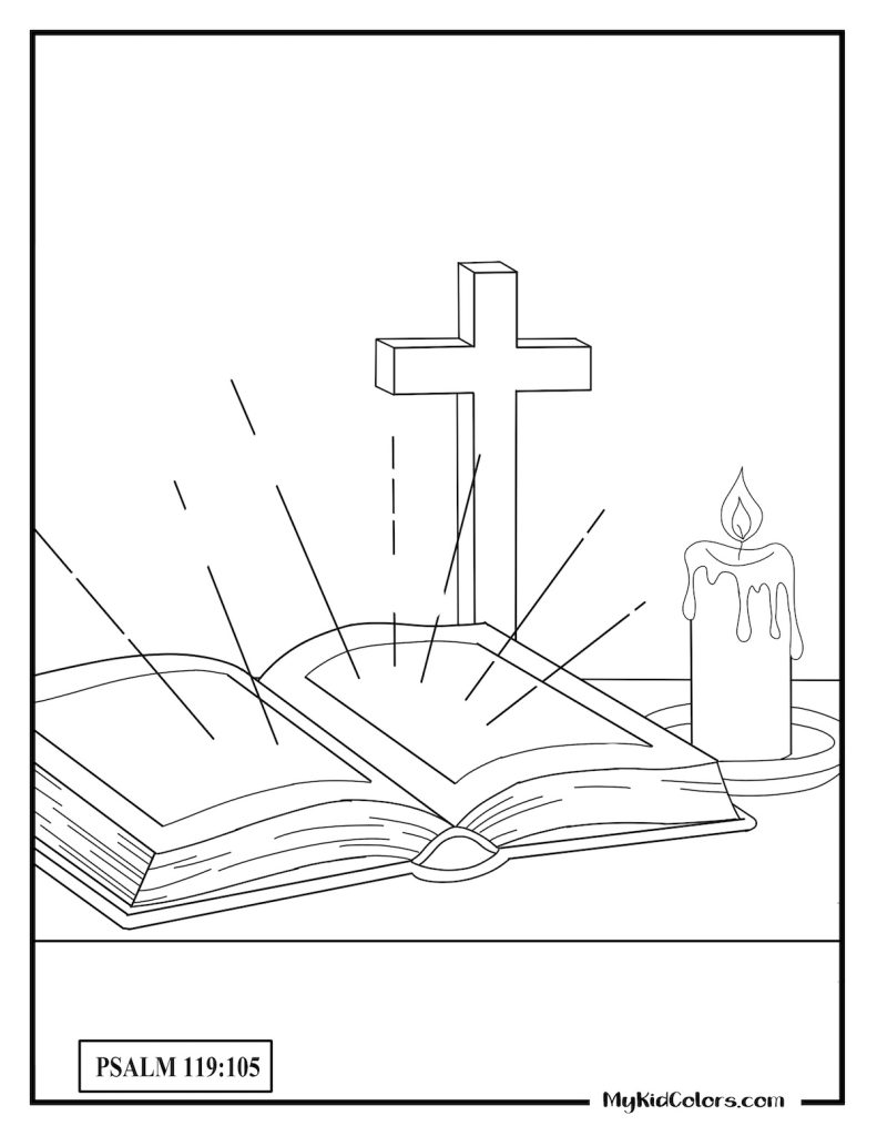 A bold text-based coloring page surrounded by rays and flowers. - Open Bible and candle – Psalm 119:105