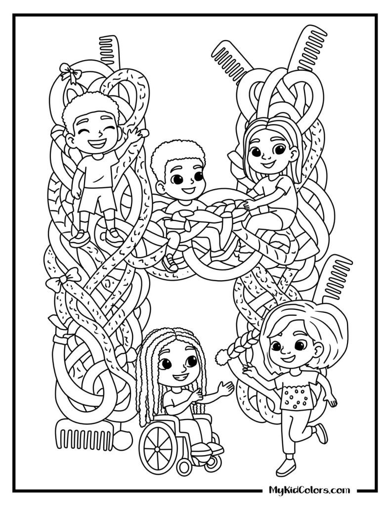 • Page 6: “H is for Hair”—a giant letter made of braids, locs, and curls that celebrates diversity in texture and inclusive play. This page helps kids explore identity while recognizing that every hair type is unique and beautiful.