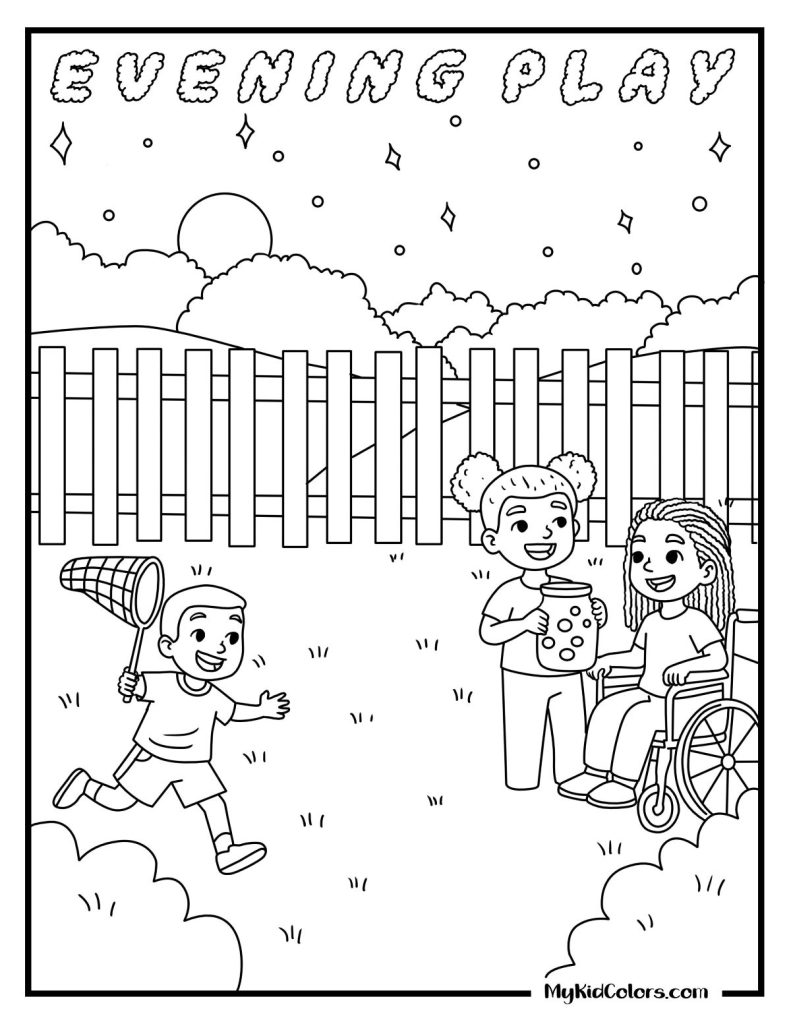 - Pages 9 & 10: Evening play and night sky observation introduce fun and curiosity, making these ideal as moon and stars activity pages and night sky coloring pages for kids.