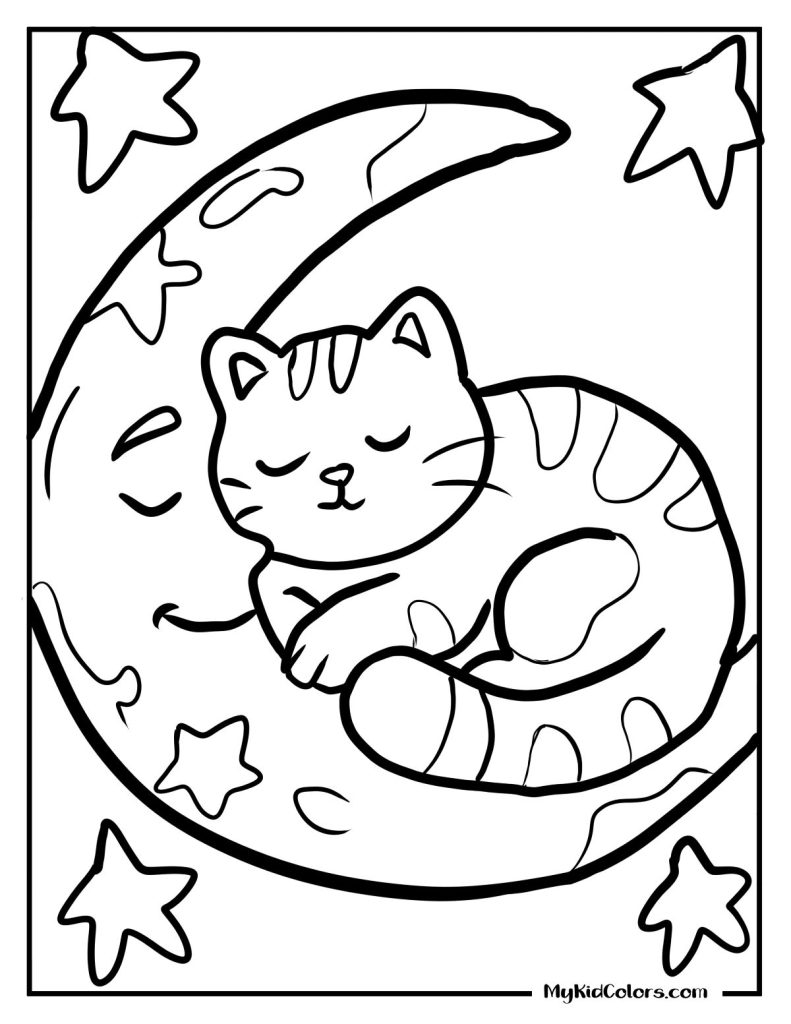 • Pages 2 & 3: Moon-Cat and The Flowing Fish: Soft, calming designs that support relaxation, sensory regulation, and peaceful end-of-day coloring routines for young children