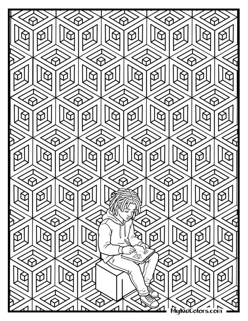 - Page 11: Optical illusion cube patternsโperfect for op art coloring pages and spatial thinking.