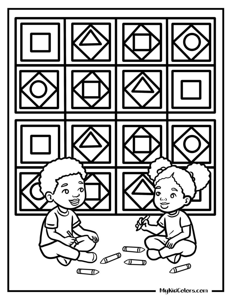 These geometric coloring pages invite children into that kind of space. A place where they can slow down, focus, and create through rhythm and repetition. No pressure, no right or wrong. Just the steady comfort of building something piece by piece, shape by shape.