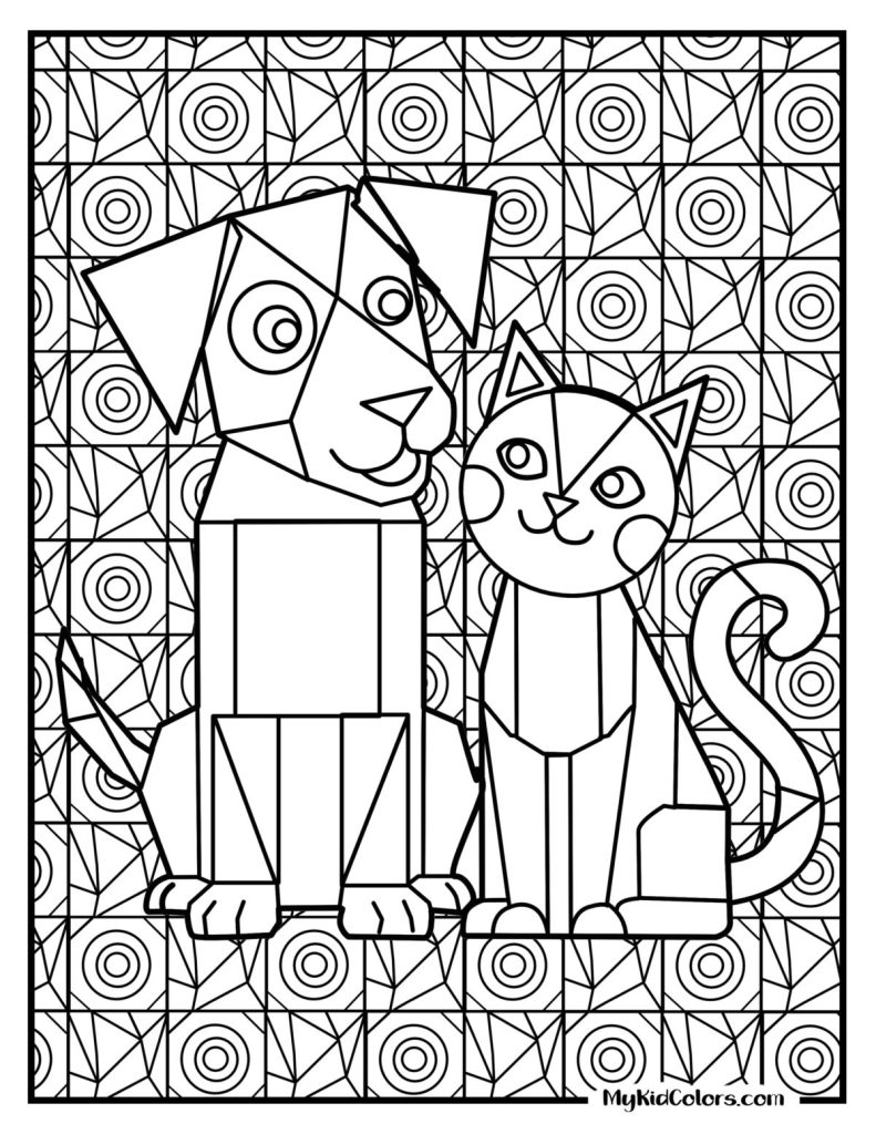 - Page 6: A geometric pet collage (dog and cat) built from shapesโgreat for coloring pages pattern recognition.
