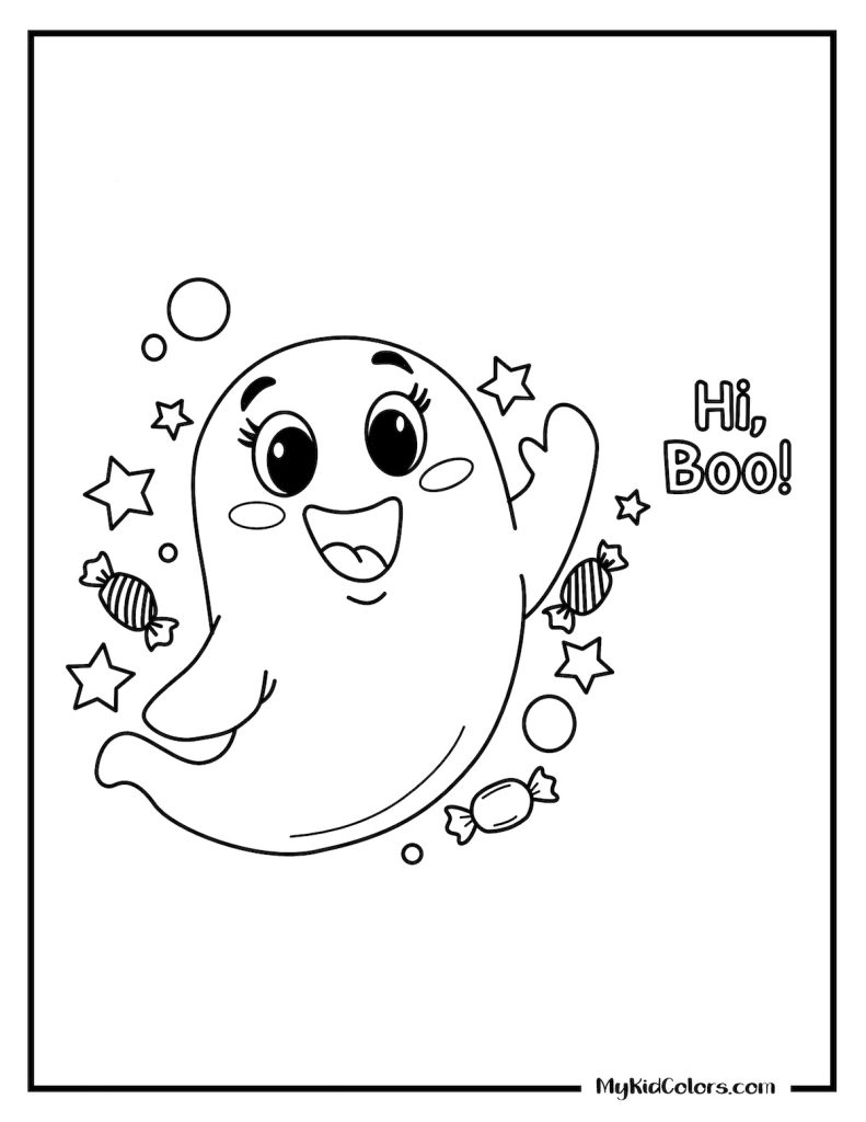 - “Hi boo!” page — a cheerful ghost waving under a sprinkle of stars.