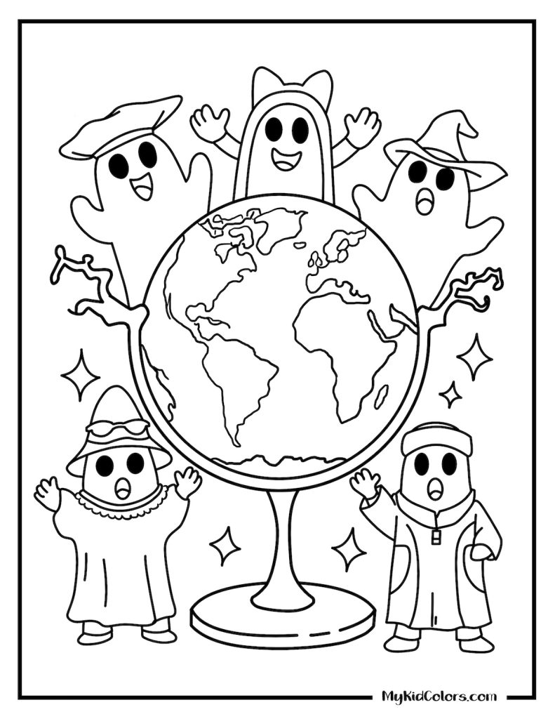 - Ghosts around the globe — whimsical scene with ghosts circling a glowing Earth.