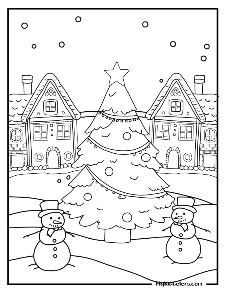 - Snowy Christmas village complete with snowmen and a Christmas tree.