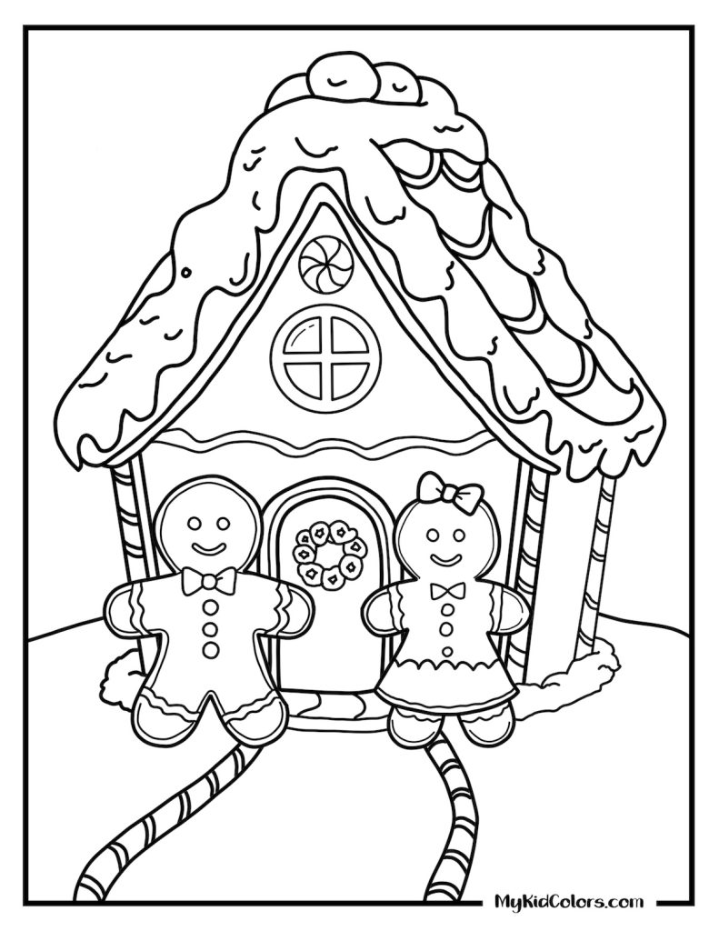 Gingerbread House Coloring Pages are printable Christmas activity sheets that feature whimsical candy cottages, gingerbread people, and holiday decorations to color and customize.