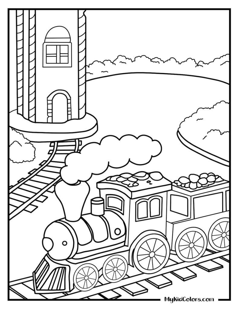 - Candy steam train passing a striped tower — perfect for creative color play.