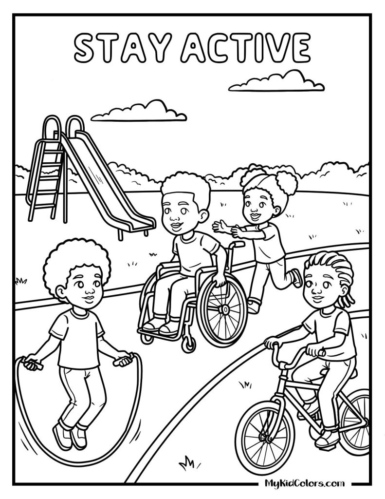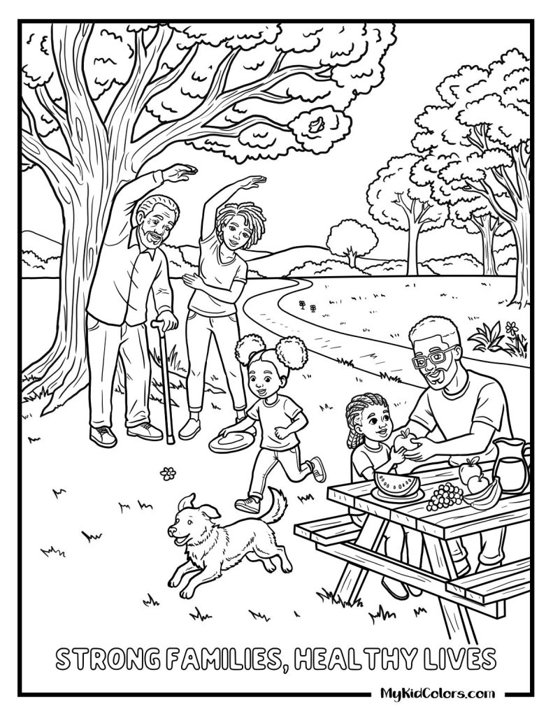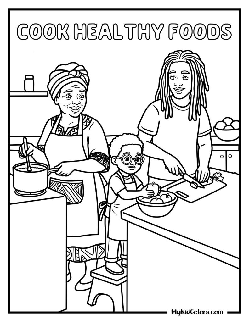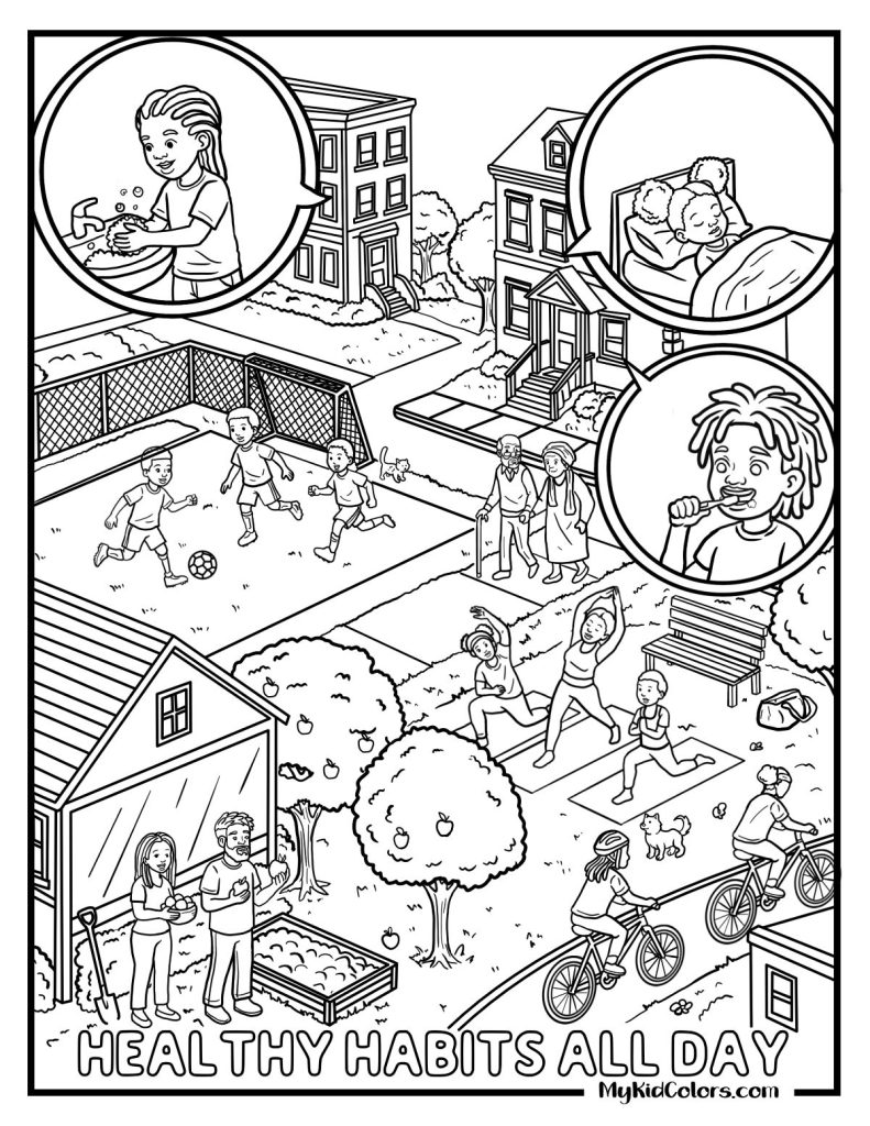- Pages 7 & 8: Outdoor play and cooking healthy meals highlight movement and nutrition, making these ideal for nutrition coloring pages and healthy living activities for kids that encourage active lifestyles.