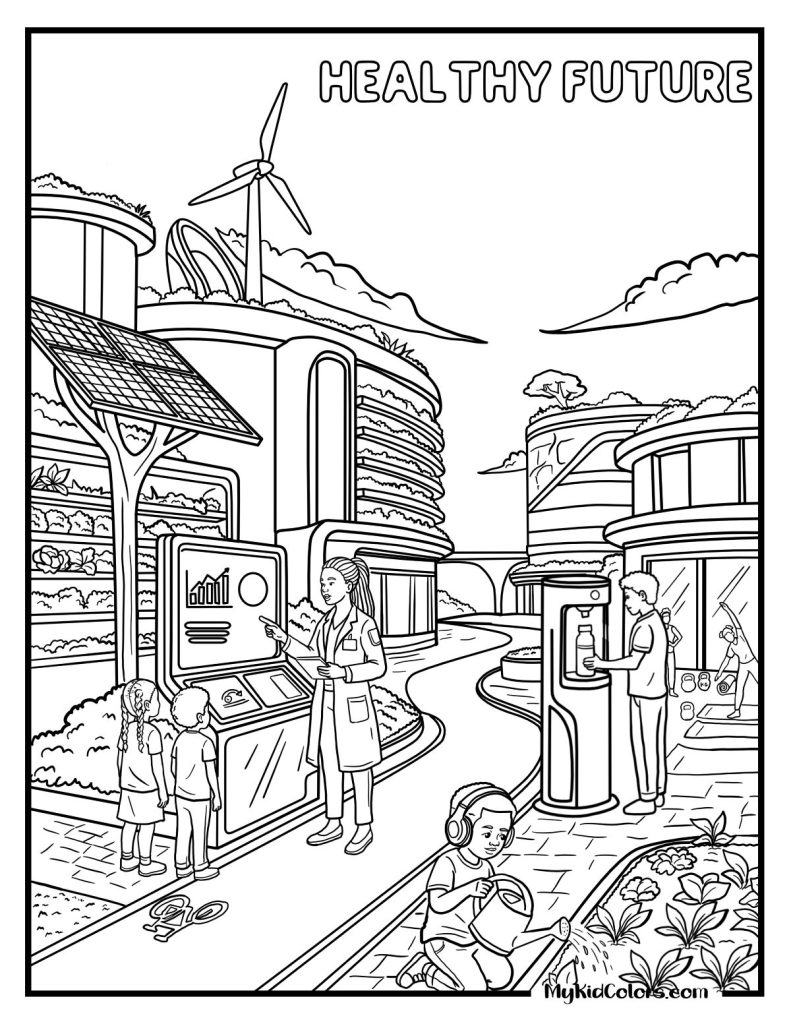 - Pages 12 & 13: Nature exploration and a futuristic wellness city encourage children to think about how health connects to the environment, community, and the future of healthy living.