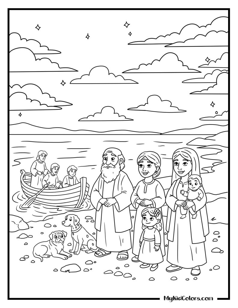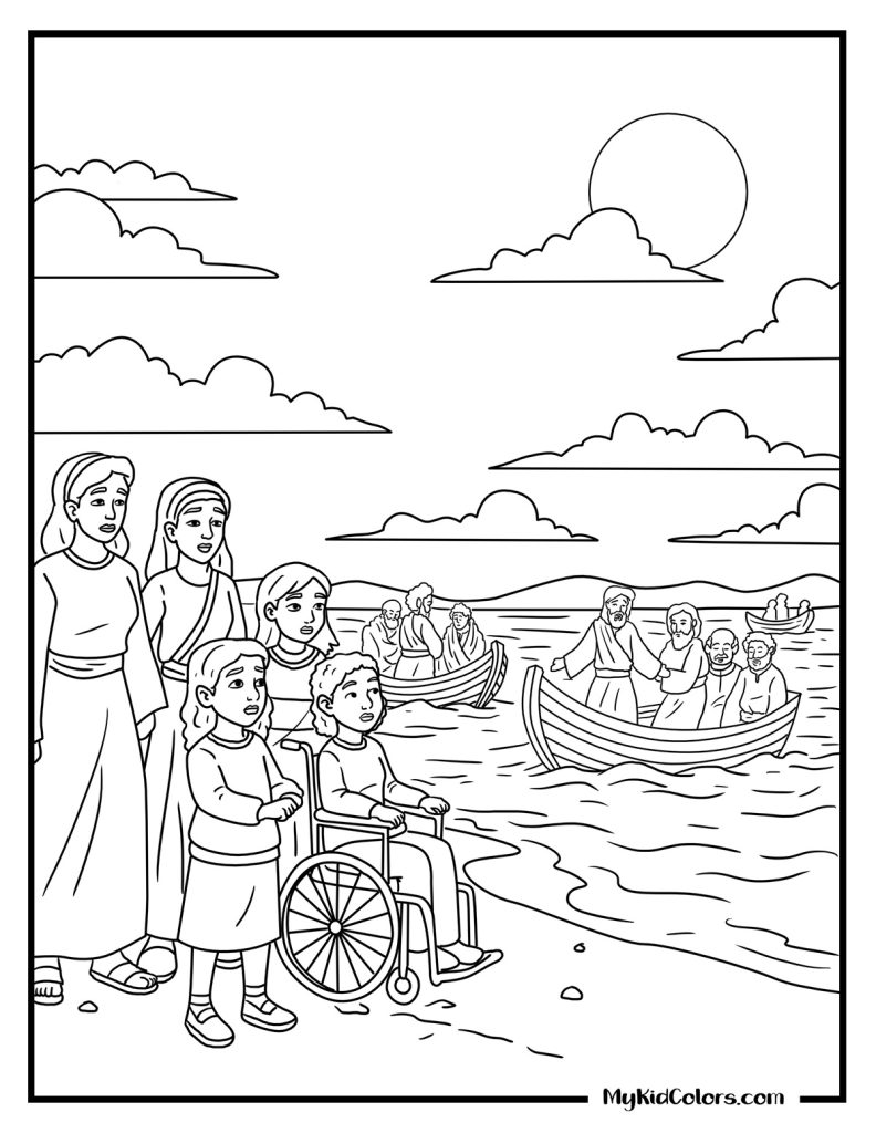 - Worship & Rest: The diverse disciples kneeling in the boat (Page 14) and a peaceful morning scene as families and pets wait on the shore (Page 15) to complete your Jesus walks on water activity page collection.