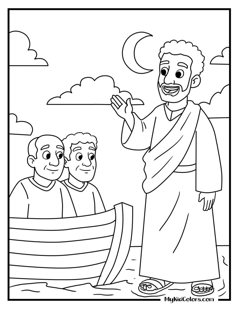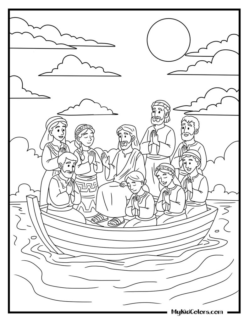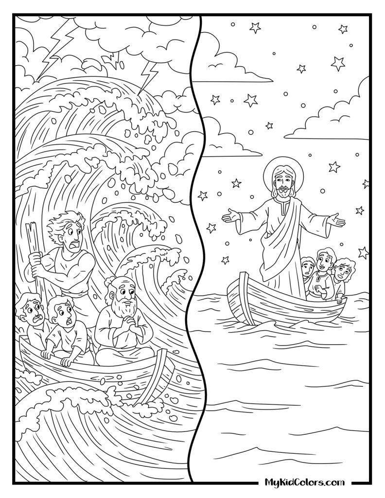 Best for toddlers and preschoolers. These pages focus on bold lines, gentle waves, and the reassuring presence of Jesus.