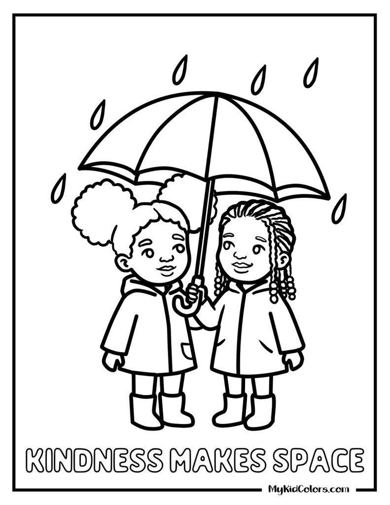 - Page 1: โKindness Makes Spaceโ shows two children sharing an umbrella, teaching kids the importance of inclusion, kindness, and making room for others.