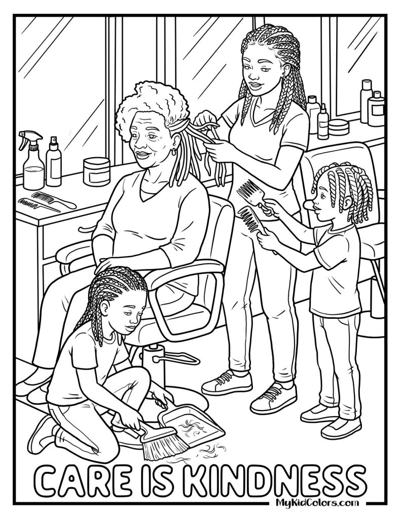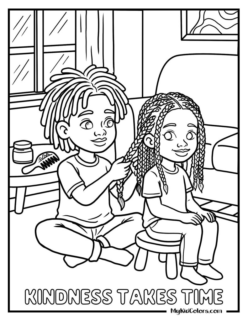 - Page 6: A hair braiding moment teaches patience, trust, and cultural care while showing how kindness can be expressed through time, attention, and shared experiences.