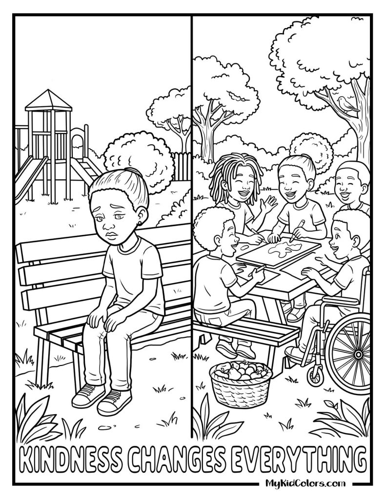 Use pages like โKindness Changes Everythingโ to create before-and-after storytelling. Ask kids to write or draw what happens next, turning coloring into a creative writing activity.