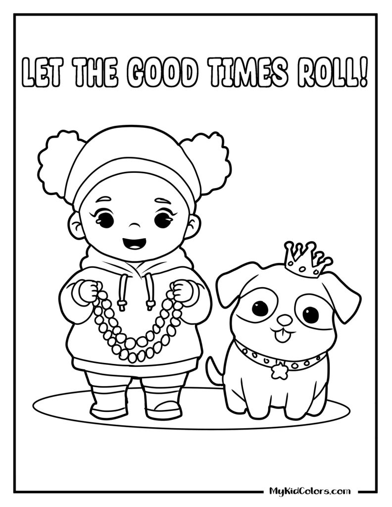 • Parade Ready:ย A smiling Black toddler holding oversized beads next to a puppy wearing a tiny crown (Page 1)โ€”perfect for aย Mardi Gras activities for kidsย station.